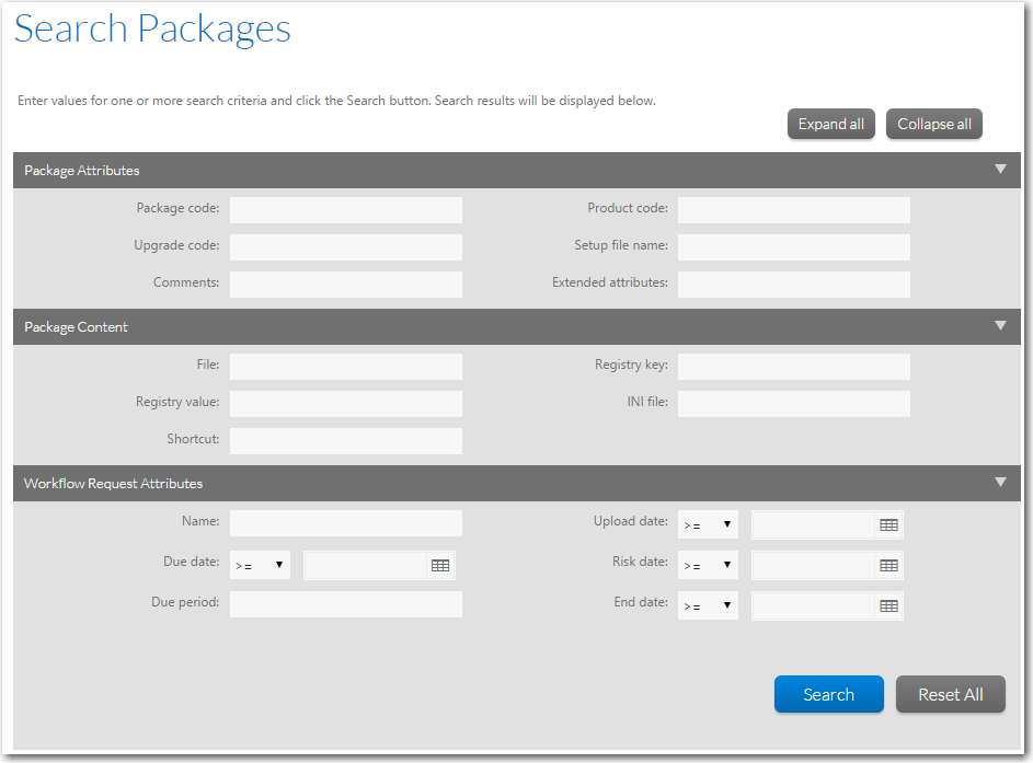 - In the Search Packages area of the Search Packages page, expand the criteria category that you want to use by clicking the arrow. When all three categories are expanded, the following fields are available: