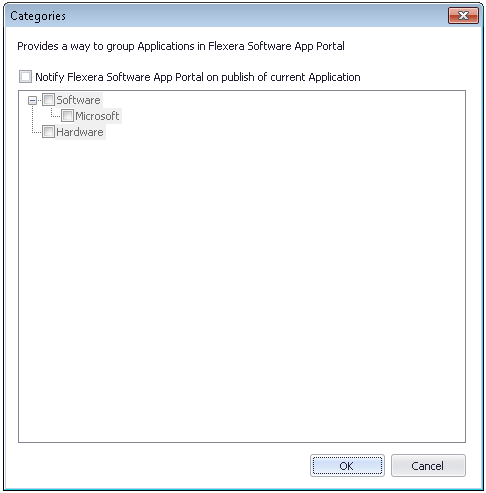 If you want a new catalog item to be created in App Portal when an application is published to System Center 2012 Configuration Manager, Symantec Altiris Management Suite, or Casper Suite Server, you need to select an option on the Categories dialog box, which is accessed from the App Portal Information tab of the Application View.