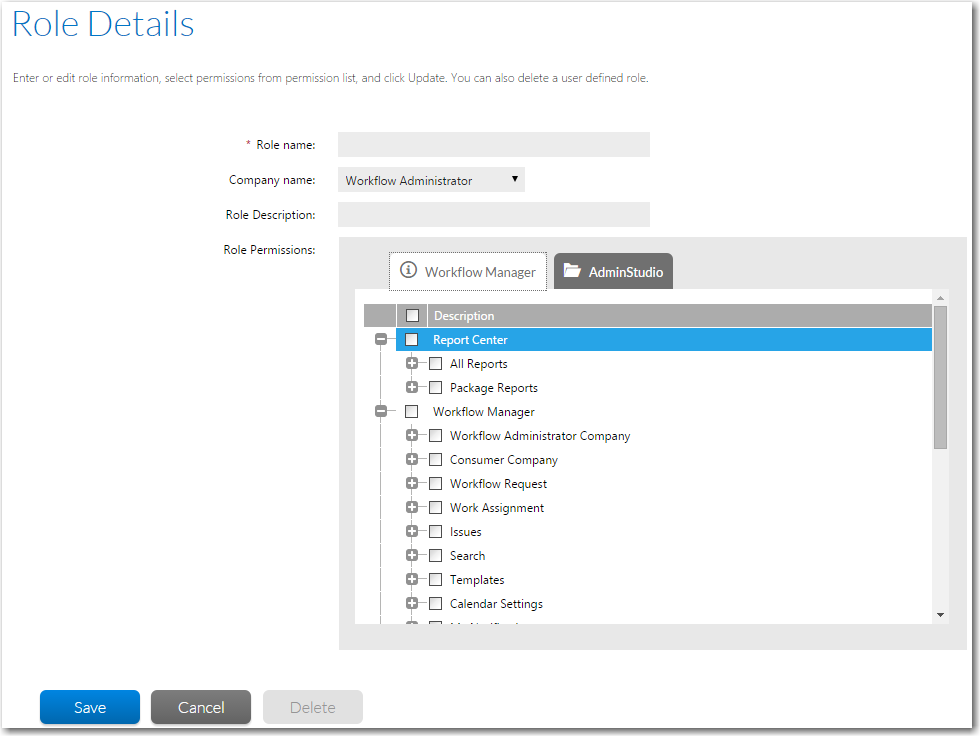 - Enter details to identify the role, and assign appropriate permissions. For more information, see Role Details Page and Role Permission Lists.