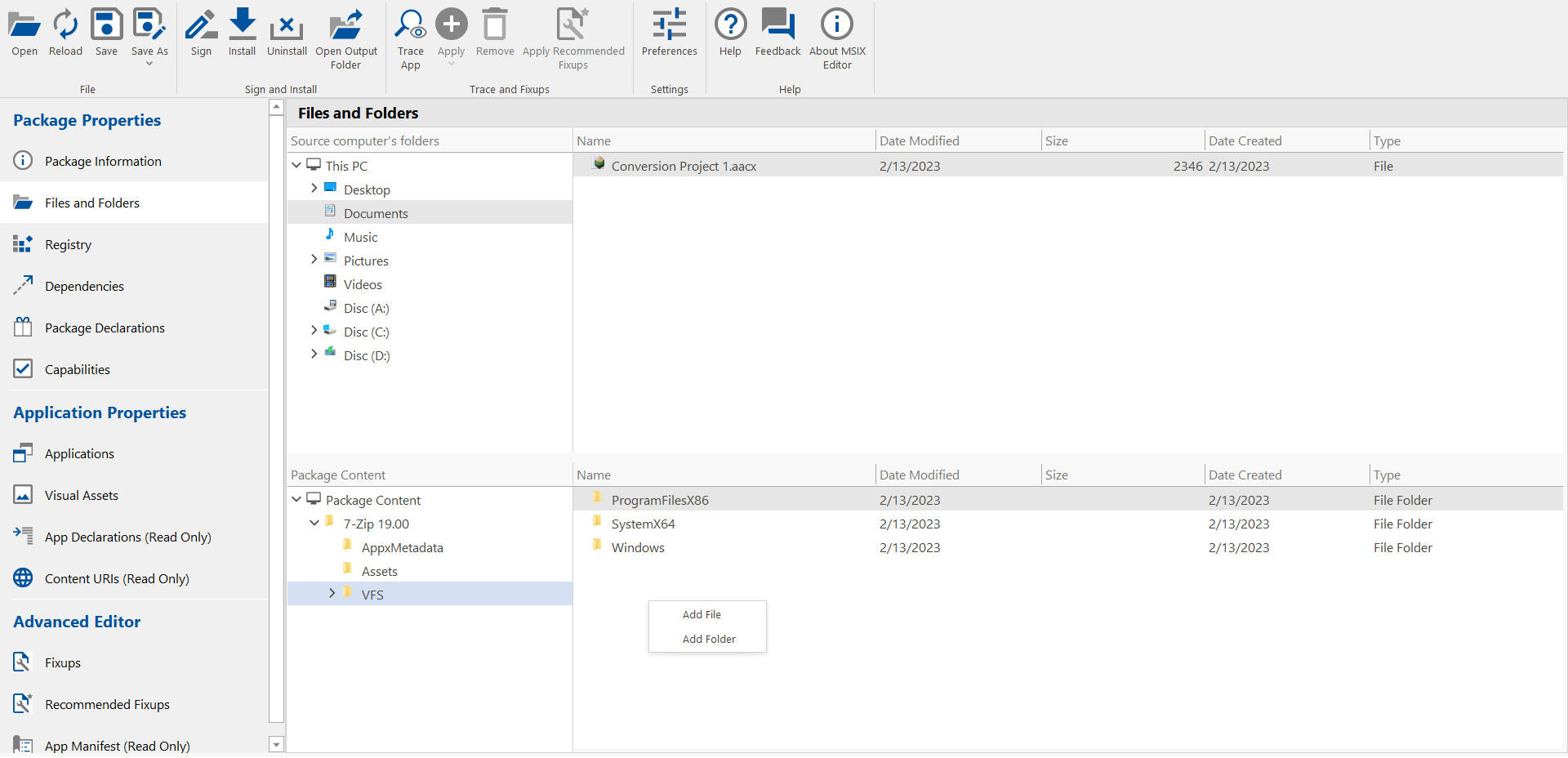 The Files and Folders view of the MSIX Editor lets you add a file or folder to your MSIX package.